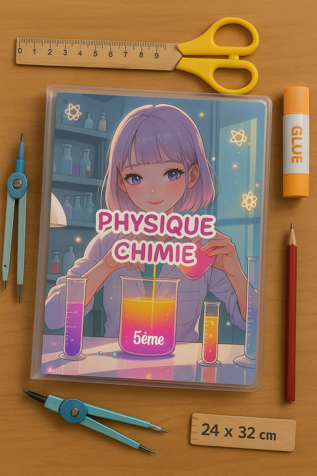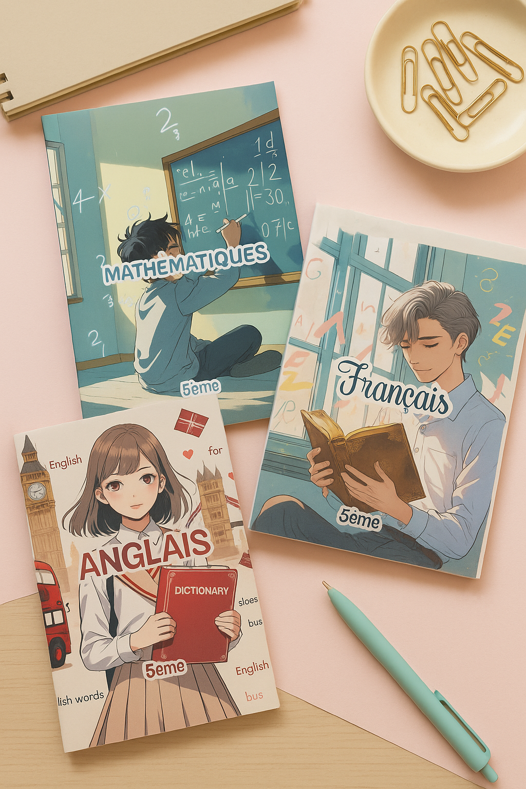 ➡️ 16 pages de garde au style manga pastel (toutes les matières principales du collège + bonus : langues, vie de classe, fiche élève)